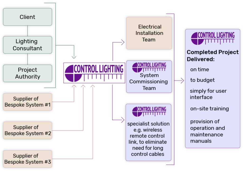 The diagram illustrates a sample project configuration. At Control Lighting, we fully acknowledge that every project is unique, in terms of the technologies, fixtures, and infrastructure adopted.